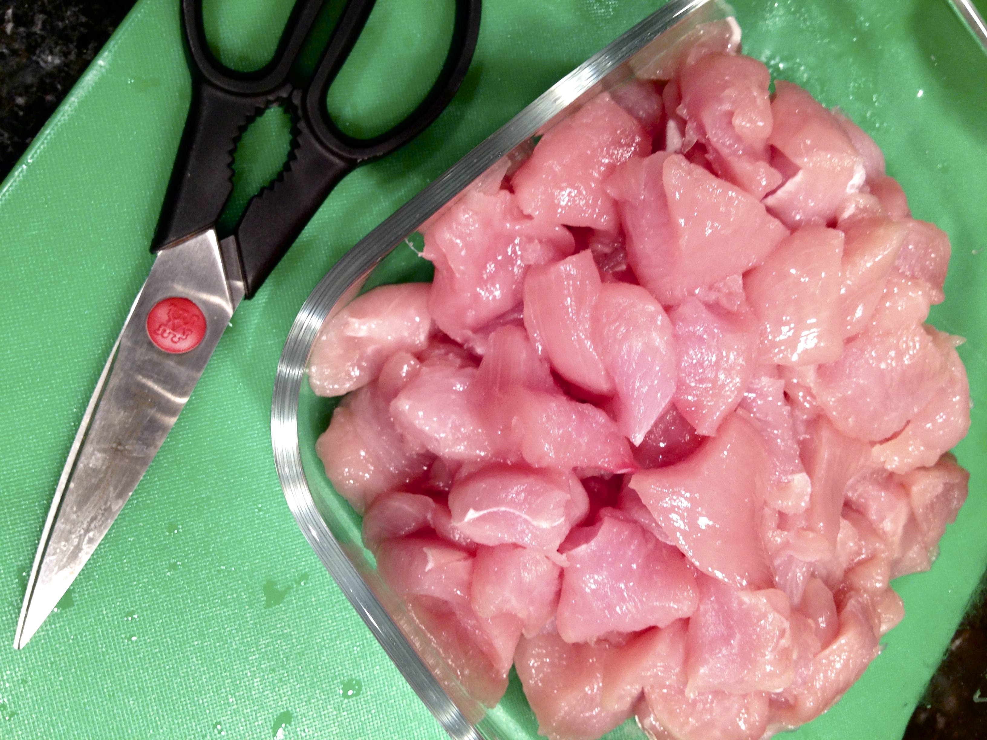 turkey cutlets cut up into cubes using kitchen/food scissors